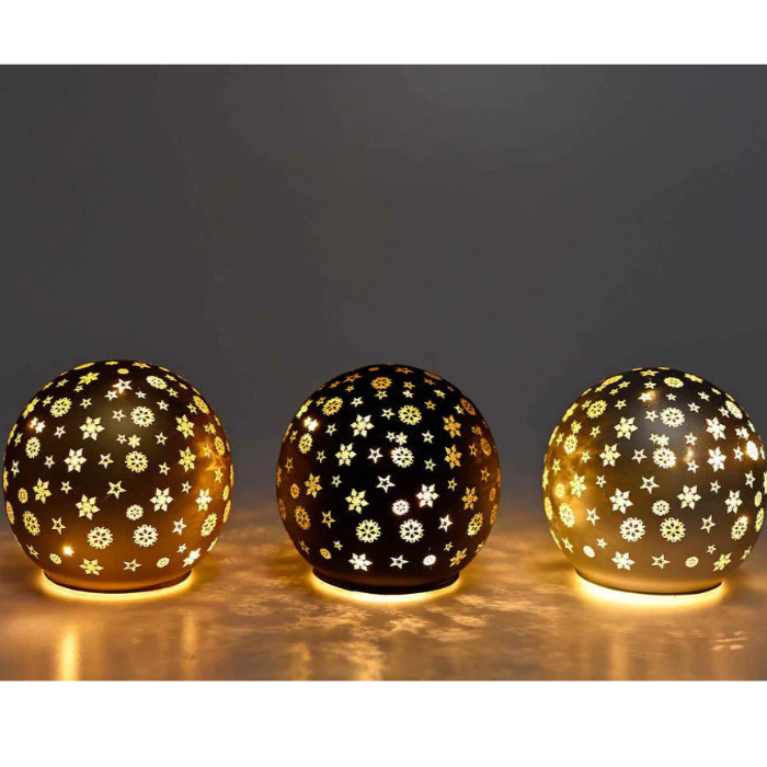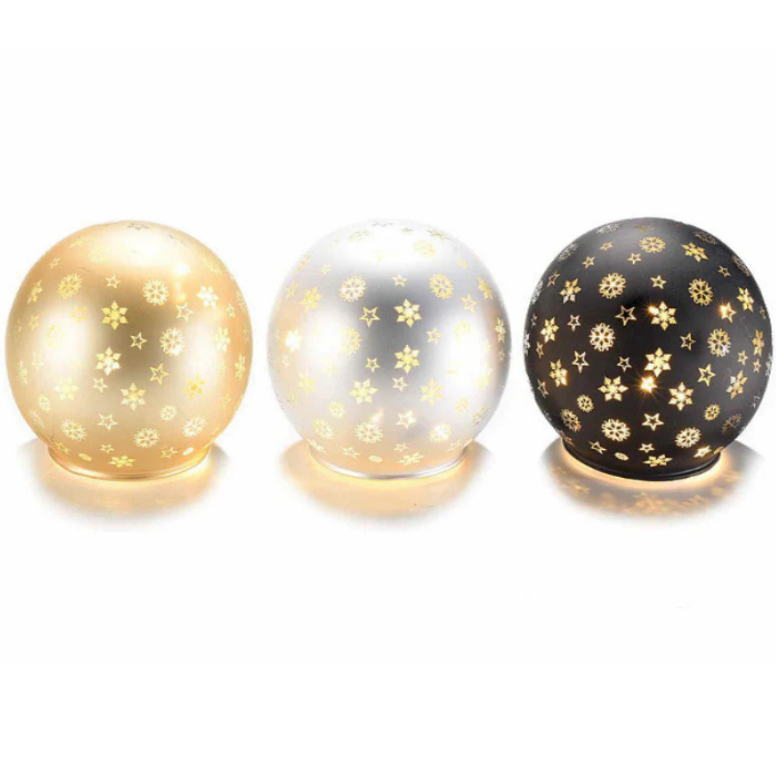 Una raffinata lampada in vetro decorato a forma di sfera illuminata dal suo interno con luci led, ideale come centro tavola o per arricchire le vostre decorazioni natalizie. Si presta ad essere abbinata ad una gift card o ad un prodotto cosmetico delle altre collezioni.