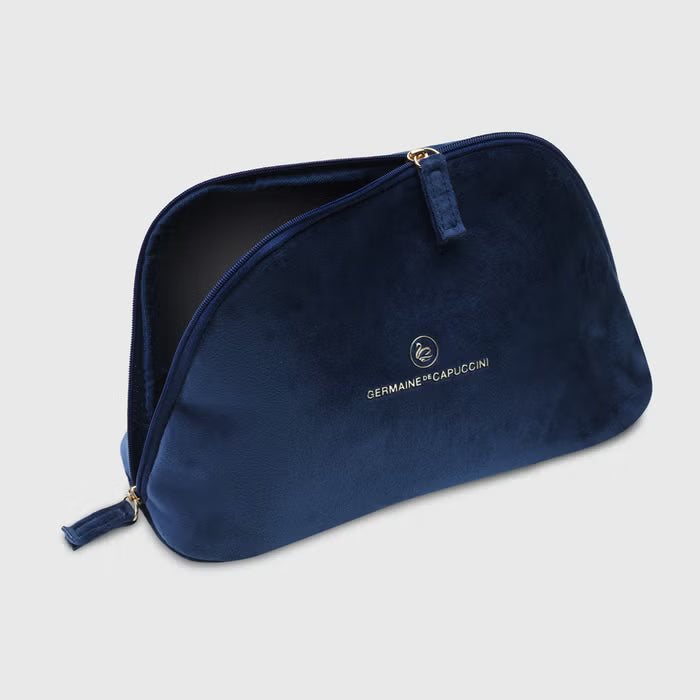 Una trousse elegante che unisce lusso e sostenibilità . Realizzata in velluto blu e impreziosita da un logo dorato, il suo design esclusivo e la composizione con il 95% di materiali riciclati esprimono un’eleganza responsabile e senza tempo.