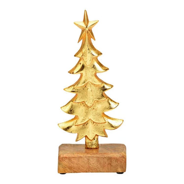 Un piccolo abete in metallo, che con la sua superficie riflette caldi bagliori dorati creando un'atmosfera di magia e splendore. Questo albero da esposizione incanta con la sua lucentezza, evocando una sensazione di meraviglia e festività .
