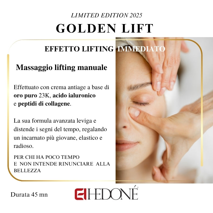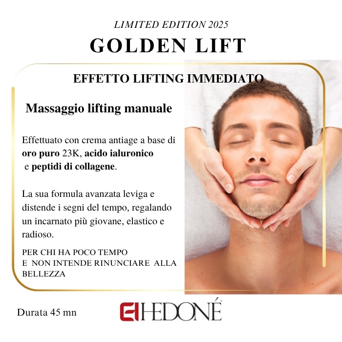 Special manual lifting effettuato con crema antiage dalle spiccate proprietà idratanti e rimpolpanti che dona subito una pelle rigenerata e luminosa.