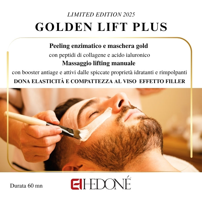 Trattamento viso versione top con peeling enzimatico e maschera gold a base di peptidi di collagene e acido ialuronico.